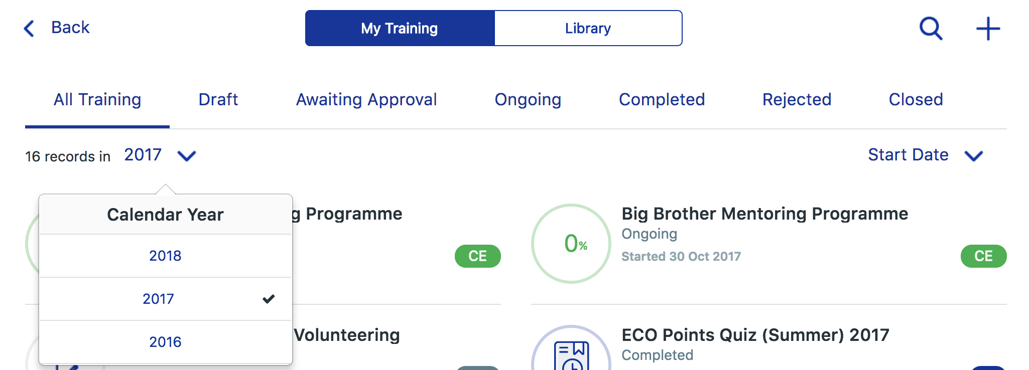 You can filter your courses by calendar year. You can also sort your courses by start date, alphabetically by title and by level.